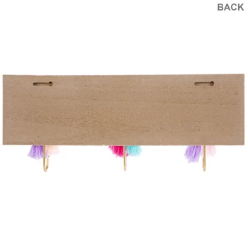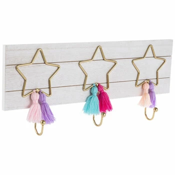 Organize your space with whimsical accents like Stars & Tassels Wood Wall Decor With Hooks. This MDF piece has a white shiplap style base, gold metal, star shaped hooks, and pink, blue, and purple tassels hanging from the stars. Use it to store coats, bags, and more with a playful look!